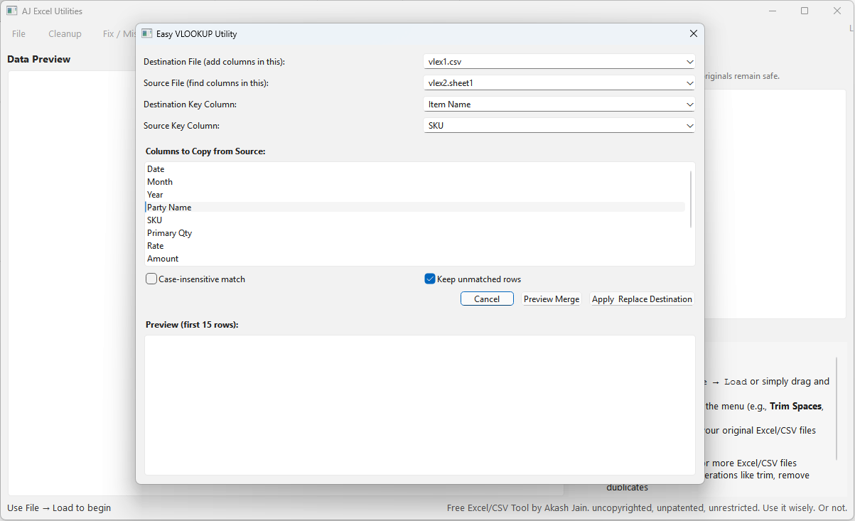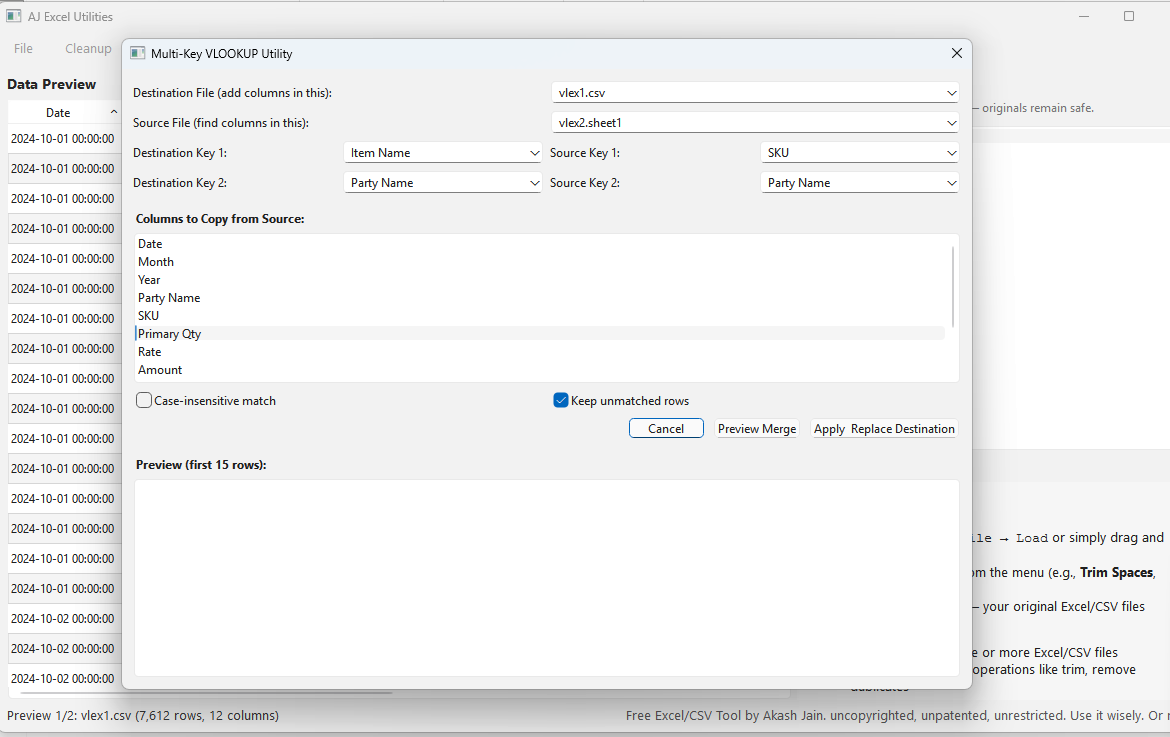 VLOOKUP()function, but simpler. Select your Destination file (the one you want to enrich) and your Source file (the one providing extra columns). Click and you have your instant VLOOKUP. - Multi-Key VLOOKUP : Performs lookups using two keys. for example, Name + City if name is not unique A live preview lets you confirm before merging.
