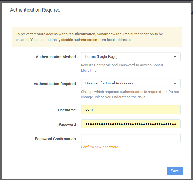 - It will ask you create an authentication method you can use forms or popup. Make sure that authentication is disabled for local addresses