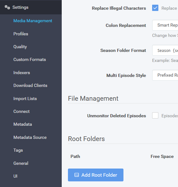 - Go to settings-> media management -> add root folder and add