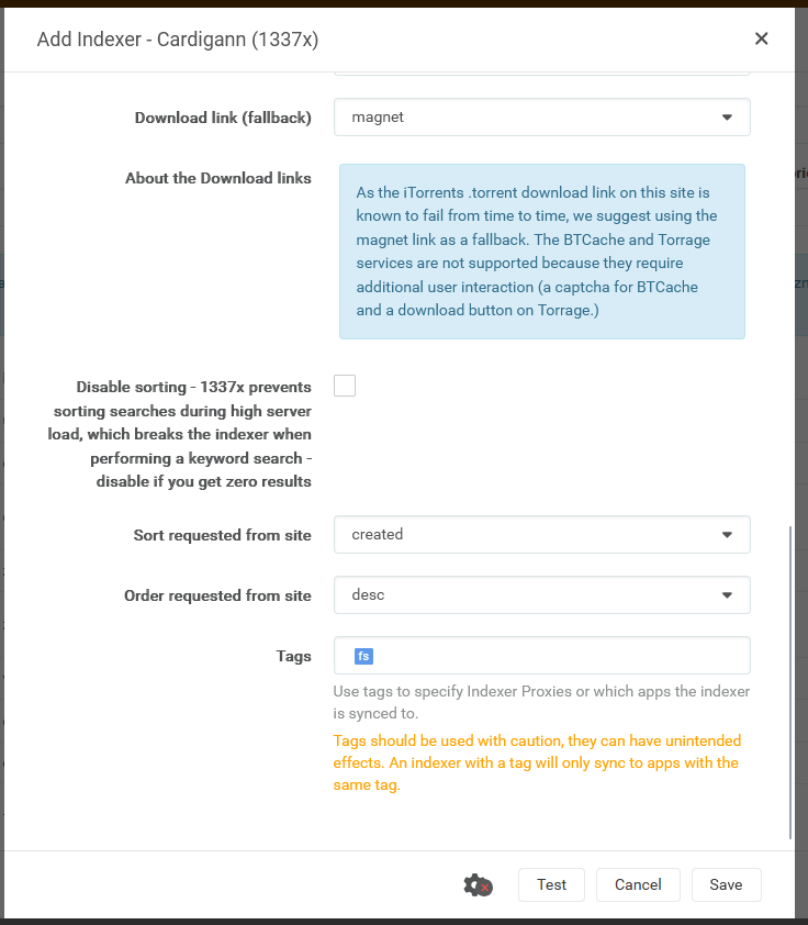 If the indexer needs cloudflare solver, use the tagfswhat we used for flaresolver. If not, leave the tag empty and add. Add as many indexers as you want. They will automatically be synced with Sonarr and Radarr.