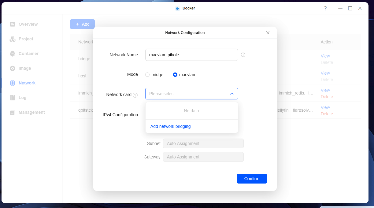 macvlan_pihole. choose the mode as macvlan - Drop down the network card, there will be nothing to select, till you create a network bridge . Click on network bridge