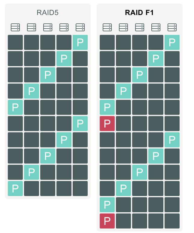 Synology F1 is similar to RAID5, except that it has one additional parity per cycle. Not per block like RAID6, but rather per cycle. This design ensures that the parity calculation has minimal impact on performance, maintaining a level of efficiency close to that of RAID5.